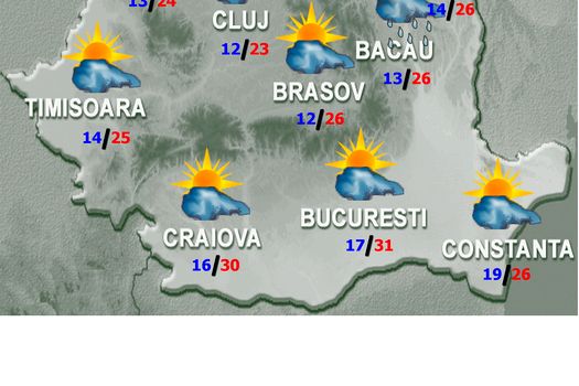 Vremea va deveni caldă în toată ţara, local călduroasă în sud şi sud-est. Cerul, variabil, va prezenta înnorări temporare ziua în vest, sud-vest, centru şi zona de munte, iar spre seară şi noaptea îndeosebi în centru, est şi sud-est. Local vor fi ploi de scurtă durată şi se vor semnala descărcări electrice. Vântul va sufla slab şi moderat, cu intensificări la munte, precum şi, local şi temporar, în regiunile extracarpatice, în special în prima parte a intervalului. Temperaturile maxime se vor încadra între 23…24 de grade pe litoral şi 34 de grade în Lunca Dunării, iar cele minime vor fi cuprinse între 14 şi 20 de grade, mai scăzute în estul Transilvaniei, spre 11 grade.