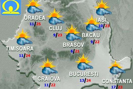 Vor fi ploi slabe pe arii restrânse în extremitatea sud-estică şi cea de vest. Vântul va sufla slab şi moderat, cu intensificări la munte, precum şi în partea de sud-est a teritoriului, în special pe litoral. Temperaturile maxime vor fi cuprinse între 19 şi 25 de grade, iar cele minime se vor încadra între 2…3 grade în depresiunile Carpaţilor Orientali şi 17 grade pe litoral.