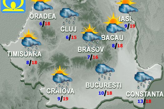 Temperaturile maxime vor fi cuprinse între 13 şi 21 de grade, iar cele minime între 4 şi 13 grade, mai scăzute în depresiuni, spre 2 grade. Temporar cerul va avea înnorări accentuate. Va ploua, mai ales după-amiaza şi în prima parte a nopţii, în sud-estul ţării şi la munte, unde pe arii restrânse cantităţile de apă vor depăşi 20…25 l/mp şi local în restul teritoriului. La altitudini de peste 1800 m, vor fi condiţii pentru precipitaţii şi sub formă de lapoviţă şi ninsoare. Vântul va sufla slab şi moderat cu unele intensificări ziua în Banat, Crişana şi Oltenia, iar noaptea în Dobrogea, sudul Moldovei şi Bărăgan.