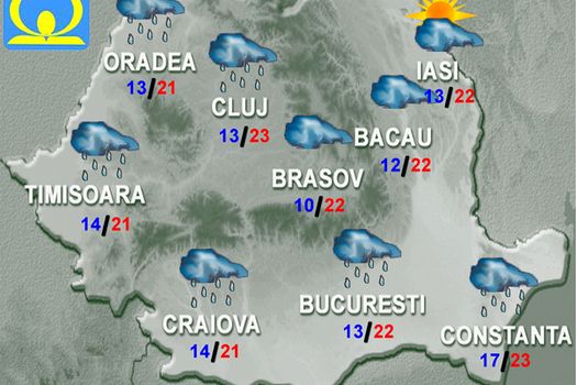 LA BUCUREŞTI: Vremea va fi rece. Pe parcursul zilei cerul va fi mai mult noros, trecător va ploua, iar vântul va sufla în general moderat. Noaptea cerul va deveni variabil şi vântul va slăbi în intensitate. Temperatura maximă se va situa în jurul valorii de 22 de grade, iar cea minimă va fi de 12…14 grade.