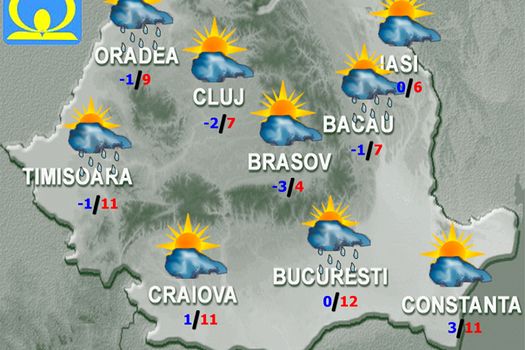 Noaptea, cerul va deveni treptat variabil şi numai pe arii restrânse vor mai fi precipitaţii slabe, mixte în centrul şi nordul teritoriului şi ninsori la munte. Vântul va continua să prezinte intensificări în cea mai mare parte a ţării, mai ales în cursul zilei, iar în zona montană înaltă va sufla tare, spulberând zăpada. Temperaturile maxime vor fi cuprinse între 2…3 grade în Transilvania şi 12…13 grade în Lunca Dunării, iar cele minime se vor încadra, în general, între -5 şi 2 grade. Local se va semnala brumă.