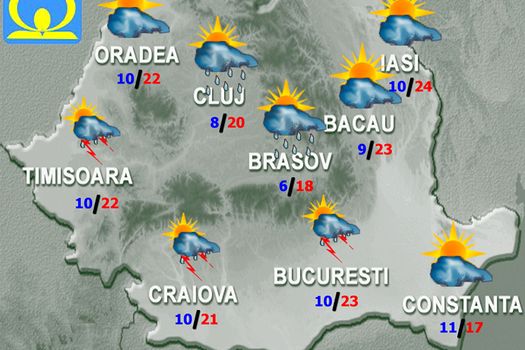 În restul teritoriului astfel de fenomene se vor semnala pe areale restrânse. Izolat cantităţile de apă vor depăşi 15…20 l/mp şi vor fi condiţii de grindină. Temperaturile maxime vor fi cuprinse între 16…18 grade pe litoral şi în depresiuni şi 24…25 de grade local în Moldova şi Muntenia, iar cele minime se vor încadra între 3 şi 13 grade. În orele dimineţii, în partea de sud-est a teritoriului, izolat va mai fi ceaţă.