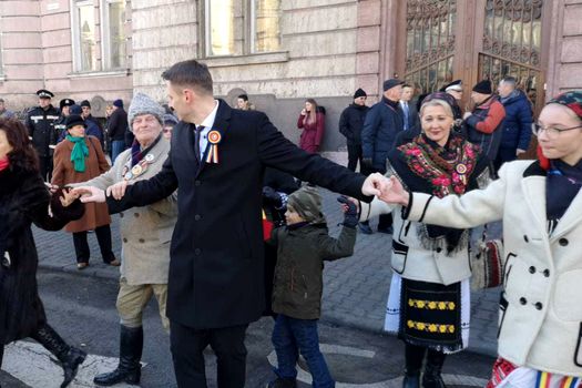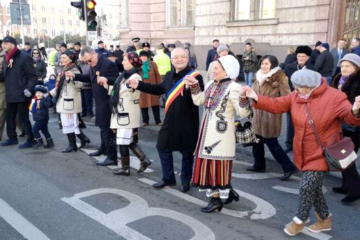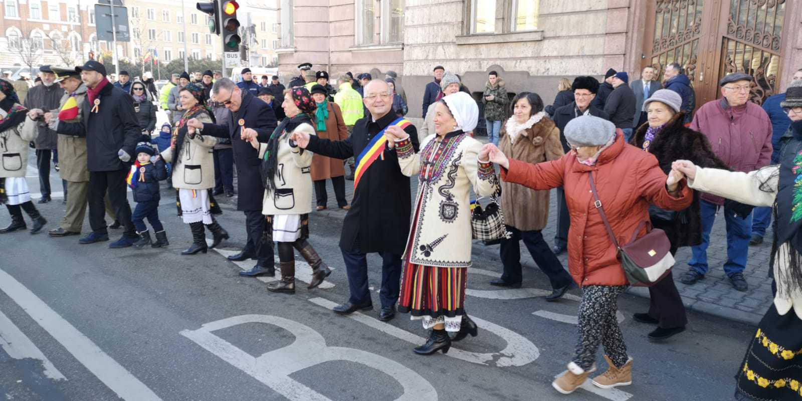 Garda de onoare, constituită din militari ai Diviziei 4 Infanterie „Gemina”, a defilat prin faţa mulţimii şi a oficialităţilor, iar la final zeci de oameni, mulţi în costume populare, s-au prins în Hora Unirii.