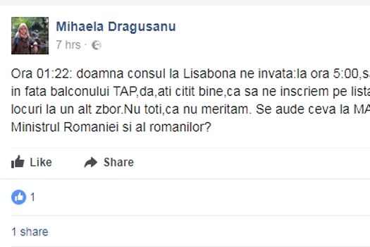 „Doamna consul la Lisabona ne învaţă, la ora 5:00, să ne îmbrâncim în faţa balconului TAP. Da, aţi citit bine, ca să ne înscriem pe listă, pentru a prinde locuri la un alt zbor. Nu toţi, că nu merităm. Se aude ceva la MAE? Dar la prim-ministrul României şi al românilor?”, a scris duminică noaptea, la ora 01:22, pe Facebook, Mihaela Drăguşanu, o turistă blocată în Lisabona.