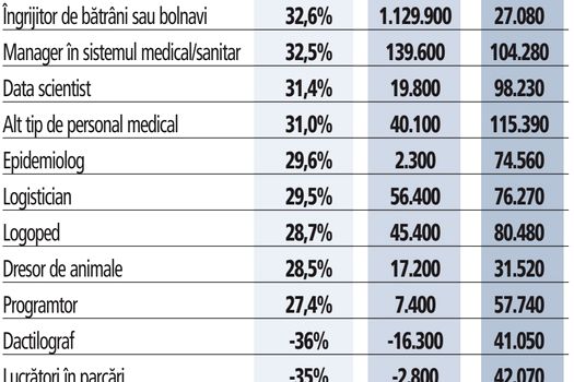 Datele arată astfel că între 2020 şi 2030 numărul de tehnicieni specializaţi în operarea turbinelor eoliene va creşte cu aproape 70%, cel mai rapid ritm. Astfel, vor fi anajate 4.700 de persoane în această poziţie. După ritmul de creştere, pe poziţiile următoare se află asistentele medicale (52%) şi instalatorii de panouri fotovoltaice (52%). În top 20 joburi pentru viitor se mai întâlnesc dresorii de animale, fizioterapeuţii şi îngrijitorii de bătrâni sau bolnavi. Într-o lume unde populaţia îmbătrâneşte, vor fi peste 1,1 milioane de noi joburi ca îngrijitor la domiciliu sau în centrele specializate. Multe dintre joburile viitorului – asistentă medicală, manaer în domeniul sanitar, epidemiolog sau fizioterapeut – vor fi de altfel în sectorul medical.