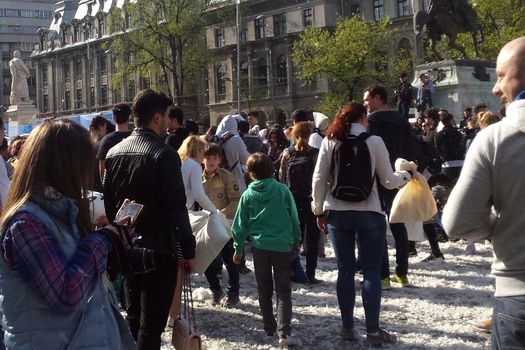 Sute de persoane s-au adunat, sâmbătă la prânz, în Piaţa Universităţii din Bucureşti pentru a participa la o bătaie cu perne. Tineri, bătrâni, copii, toţi şi-au adus pernele de acasă şi au aşteptat nerăbdători să se dea startul.