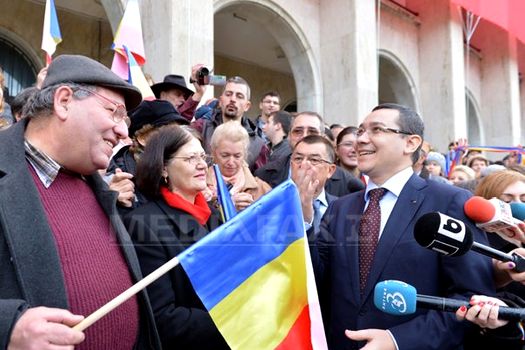 „Sper că de acum încolo, în fiecare an, oricine va fi prim-ministru, oricine va fi preşedinte, oricine va fi şeful Parlamentului, de Ziua Naţională să folosească această idee. E un lucru pe care ni-l redescoperim după 1989„, a spus Ponta.