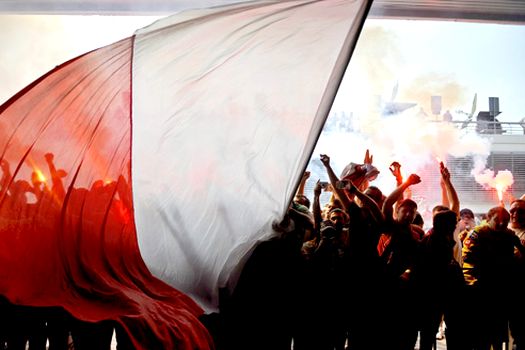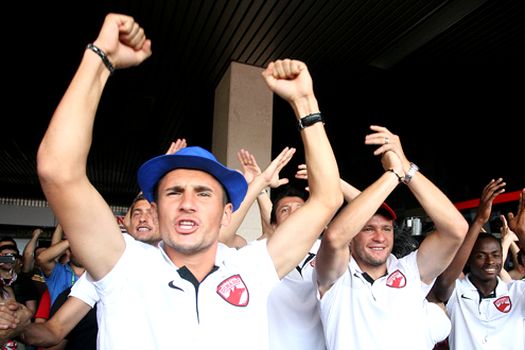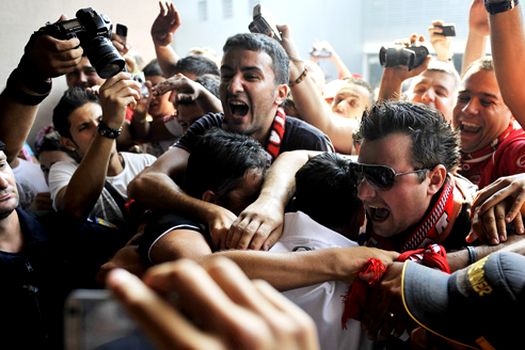 Cei 300, fericiţi de reuşita echipei, au ales să vină vineri la aeroport şi să-i aştepte pe jucători. Numai că prezenţa grupului de suporteri – care imediat ce au ajuns acolo au devenit triviali, asumându-şi pe faţă, prin bannere, statutul de huligan – a fost imposibil de gestionat.