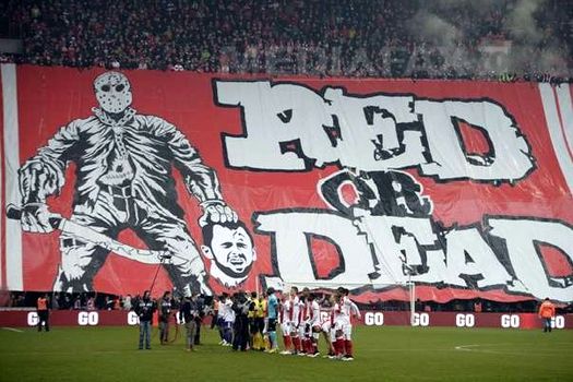 La intrarea echipelor pe teren, un grup de suporteri ai gazdelor a desfăşurat bannerul pe care se putea vedea un bărbat mascat ce ţine într-o mână o macetă şi în cealaltă capul lui Steven Defour, alături fiind scris mesajul: „Red or dead” (Roşu sau mort).