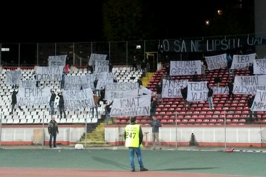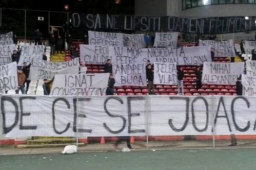 Suporterii de la Peluza Cătălin Hîldan au arborat un steag mare de culoare neagră, au întins o pânză neagră deasupra căreia au aprins lumânări şi au afişat un banner pe care scria „Corupţia ucide”.