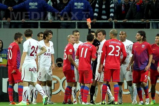 Fundaşul rapidist Ezequias Tavares a fost eliminat în minutul 75, după ce l-a călcat pe gleznă pe stelistul Tiberiu Bălan. Cei prezenţi pe banca rapidiştilor au protestat vehement la adresa arbitrului de rezervă Radu Petrescu, cel care i-a semnalizat lui Tudor intrarea dură a lui Ezequias.