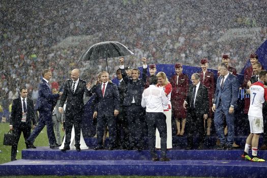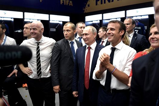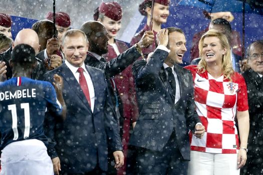 Preşedintele Franţei, Emmanuel Macron a stat alături de Kolinda Grabar-Kitarović, preşedintele Croaţei şi Vladimir Putin, toţi zâmbitori ca şi cum nu era niciun conflict în Donbas, chiar când echipa naţională de fotbal a Franţei îşi primea trofeul.