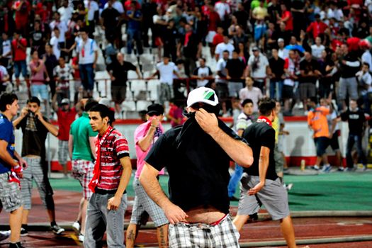 După imobilizarea acestuia, suporterii de la Peluza Cătălin Hâldan au păstruns pe pista de atletism a stadionului din Bulevardul Şoseaua Ştefan cel Mare, iar arbitrul a fluierat pentru ca jucătorii să intre la vestiare. În drum spre vestiare, fanii de la Tribuna a II-a au aruncat cu obiecte înspre jucători. Forţele de ordine au intervenit cu gaze lacrimogene pentru a îndepărta suporterii de la tribuna a II-a, în următoarele minute fanii părăsind tribunele.