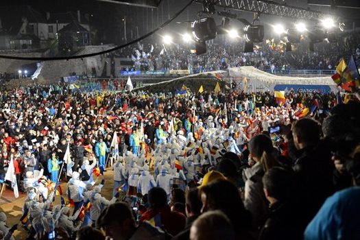 România, în calitate de ţara gazdă a intrat ultima pe stadion, iar tricolorul a fost purtat de schiorul fondist Pripici Florin Daniel, multiplu medaliat la Campionatele Europene la U18.