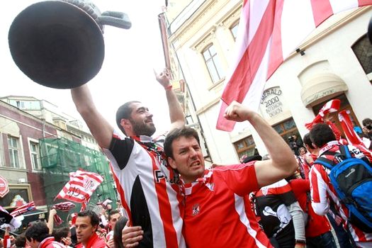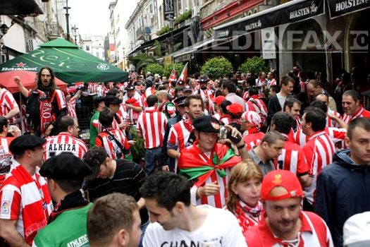 Suporterii spanioli au pus stăpânire pe străduţele din Centrul Vechi al Bucureştiului. Obiectivul principal al armatei alb-roşii a fost să cucerească toate barurile şi cluburile şi să instaureze acolo regimul fiestei şi al distracţiei.