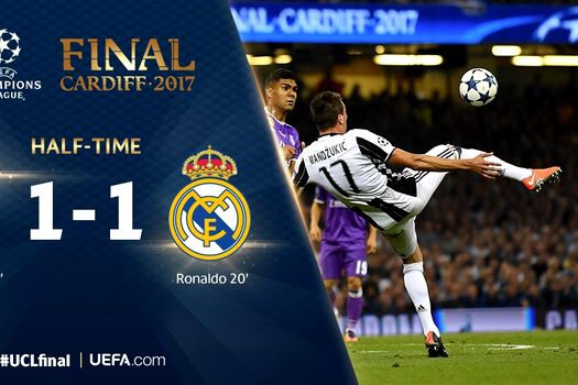UPDATE 22:33 S-au arătat două minute suplimentare pentru prima repriză a finalei! Real Madrid este fromaţia care atacă în finalul reprizei. Pauză la Cardiff! Cristiano Ronaldo a deschis scorul în minutul 20 dar Mandzukic a egalat cu un gol de generic după numai şapte minute, informează ProSport.