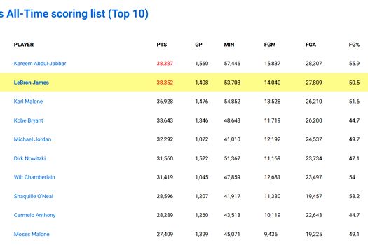 În Top 10 cei mai buni marcatori din NBA nu se află niciun alt sportiv în activitate.