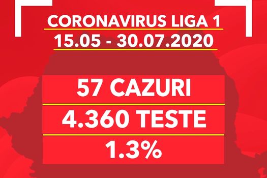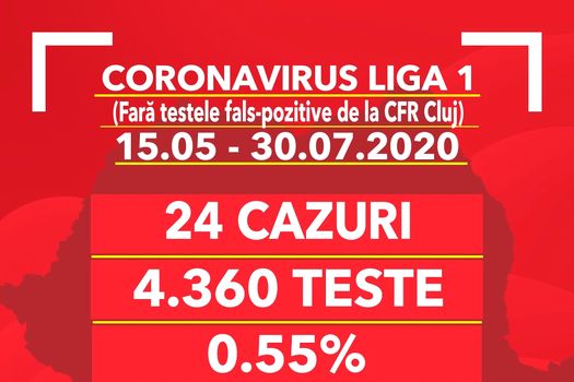 Au existat însă şi teste fals-pozitive. CFR Cluj a anunţat pe data de 28 iulie că testele a 23 dintre jucători, făcute la o clinică din Bucureşti, au fost eronate. Ceea ce înseamnă că numărul total de cazuri din Liga 1 a fost de doar 24, iar rata de infectare reală din fotbal este de 0.55%.