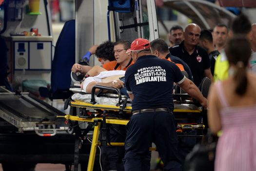 Bucureşti. Jucătorii şi suporterii şi-au pus mâinile în cap. Cu câteva secunde înainte ca ambulanţa să intervină, Neagoe părea foarte palid, iar cei din staff îşi făceau griji pentru starea sa.