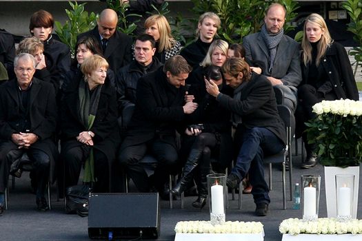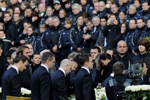 Înaintea începerii ceremoniei religioase, jucătorii naţionalei Germaniei i-au adus un omagiu lui Enke, la sicriul depus în mijlocul stadionului AWD-Arena.