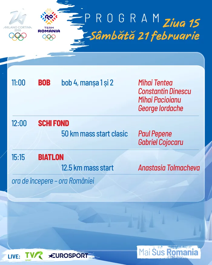 Comitetul Olimpic și Sportiv Român a publicat, sâmbătă, programul de astăzi al sportivilor români care participă la Jocurile Olimpice de iarnă de la Milano Cortina.
