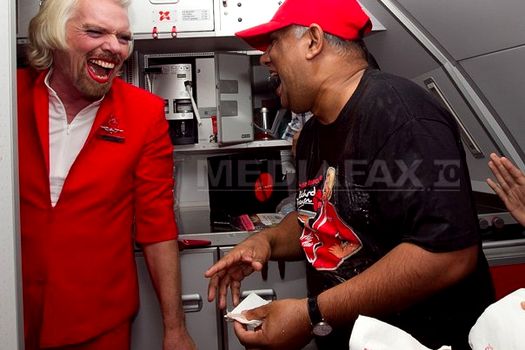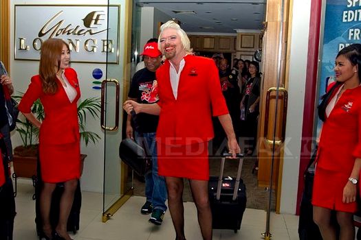 Îmbrăcat cu o vestă şi o fustă scurtă, cu ruj roşu şi pantofi de aceeaşi culoare, miliardardul a oferit servicii pasagerilor pe un zbor de peste cinci ore între Perth (Australia) şi capitala Malaysiei, Kuala Lumpur.