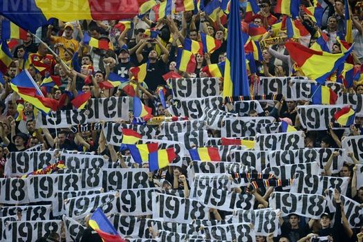 Suporterii români de la peluza S au făcut o coregrafie cu steagul României, iar conturul ţării era realizat din cartoane albe. În interior, era desenat un suporter cu mâinile ridicate. „Vă aşteaptă izbânda, vă aşteaptă şi fraţii, nădejdea e numai la voi”, era mesajul arborat de fani. De asemenea, a fost afişat următorul banner: „Mărăşeşti, pe aici ungurii nu trec”. Pe mai multe pânze ale fanilor scria: „1918”, dar a mai fost afişat şi un alt banner pe care scria: „4 iunie 1920”, cu referire la semnarea tratatului de la Trianon. „Salvaţi Roşia Montană”, „Câştigăm aurul la Jocurile Olimpice”, „Stop Chevron”, au fost alte mesaje ale fanilor români.