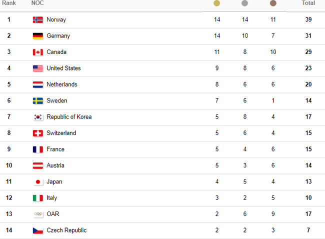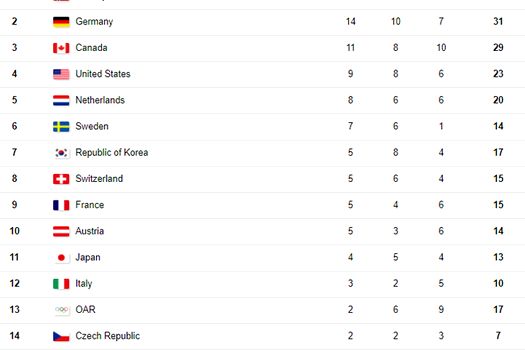 În urma acestui rezultat, Germania a pierdut ocazia de a termina în frunte în clasamentul pe naţiuni. Nemţii au avut acelaşi număr de titluri olimpice cu Norvegia – 14, dar nordicii au câştigat ”barajul” la medalii de argint, 14-10. Norvegia a terminat pe primul loc după o nouă medalie de aur cucerită de Marit Bjoergen la schi fond, în proba de 30 kilometri clasic cu start în bloc.