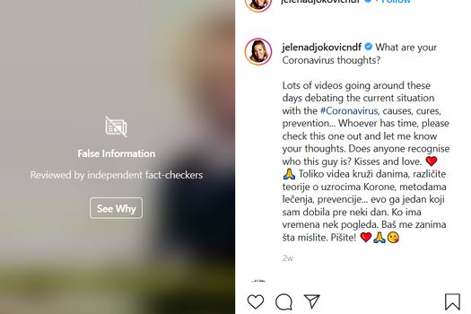 O postare făcuta de soţia lui Novak Djokovic, Jelena, pe 1 aprilie, a fost catalogată drept ştire falsă de Instagram. Ea postase un clip în care un presupus expert american susţinea că există o legătură între tehnologia 5G şi coronavirus. Sârboaica a revenit apoi cu un mesaj în care a transmis că nu susţinea că informaţiile din clip sunt reale sau nu. Peste 90.000 de oameni apucaseră să vadă clipul respectiv. Unii au criticat-o însă pe Jelena pentru decizia de a distribui clipuri conspirative. Instagram, aplicaţia deţinută de Facebook, apelează la o echipă independentă care verifică acurateţea informaţiilor publicate în platformă.
