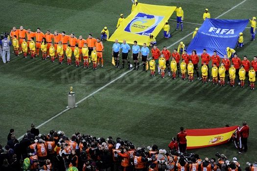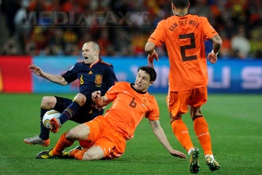 Cartonaşe galbene: Van Persie ’15, Van Bommel ’22, De Jong ’28, Van Bronckhorst ’54, Heitinga ’57, ‘109, Robben ’84, Van der Wiel ‘111, Mathijsen ‘117 / Puyol ’16, Sergio Ramos ’23, Capdevila ’67, Iniesta ‘118.