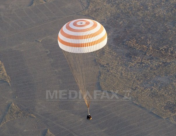 Ei au aterizat într-o capsulă Soyuz suspendată de o paraşută albă mare în regiunea Djezkazgan, în stepele Kazahstanului, pe o vreme favorabilă dar rece, potrivit imaginilor difuzate de televiziunea rusă.