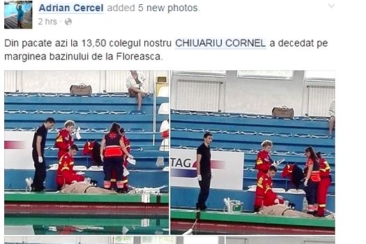 Adrian Cercel este colegul fostului jucător de polo Cornel Chiuariu, decedat sâmbătă la Bazinul Floreasca. Într-un mesaj pe Facebook, bărbatul a anunţat ”Din păcate azi la 13,50 colegul nostru CHIUARIU CORNEL a decedat pe marginea bazinului de la Floreasca”. Alături de mesaj au fost adăugate şi imagini de la locul tragediei.