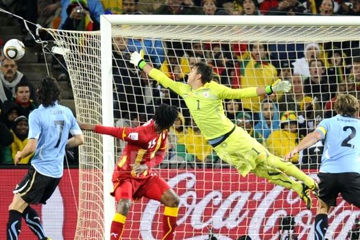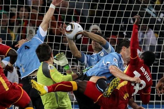 Ghana a ratat, prin Gyan, în ultimul minut al prelungirilor, penaltiul care i-ar fi putut aduce calificarea în semifinale. În minutul 120+1, Luis Suarez a fost eliminat deoarece a respins cu mâna de pe linia porţii un balon trimis de Appiah.