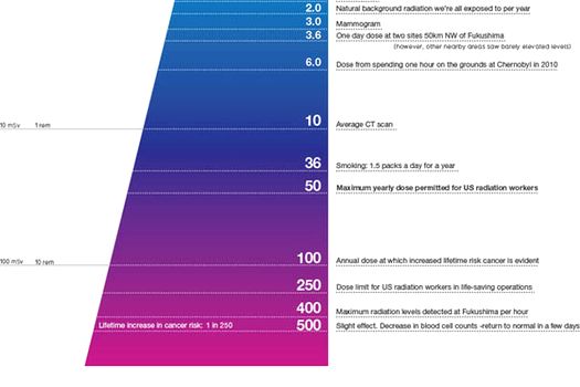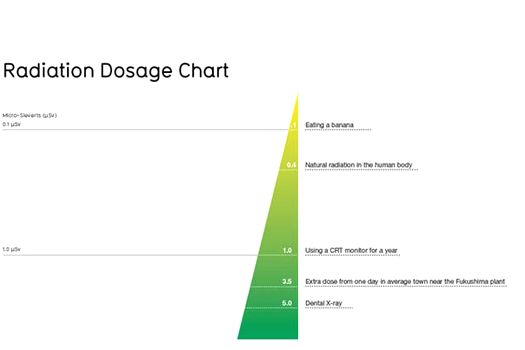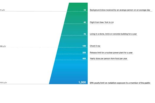 Potrivit www.informationisbeautiful.net , care a realizat graficul, numeroase activităţi zilnice, chiar şi cele mai banale, ne expun radiaţiilor. De exemplu, dacă locuiţi într-o clădire din piatră, cărămidă sau beton timp de un an, vă expuneţi unor radiaţii de 70 de microsieverţi, iar doza de radiaţii pe care o persoană o absoarbe din alimente în timpul unui an este de 400 de microsieverţi.