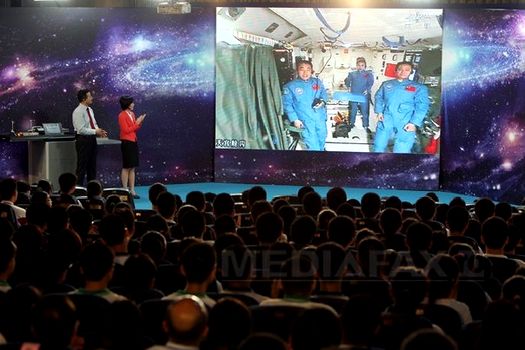 Evenimentul a fost prezentat în direct într-o emisiune difuzată de televiziunea de stat chineză şi a inclus un joc de tipul „întrebări-răspunsuri” la care au participat astronauta chineză şi elevii unui liceu din Beijing.