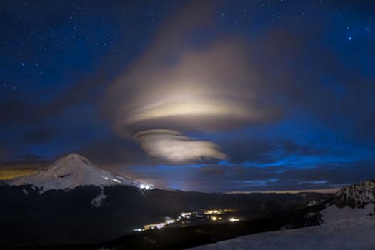 Norii lenticulari se pot forma doar în condiţii potrivite. De exemplu, în locul unde a fost făcută această fotografie, la muntele Hood din Oregona, Statele Unite, astrofotograful Ben Canales a surprins acest fenomen pentru prima oară. Imaginea a fost făcută în acest an, la mijlocul lunii martie, cu aproximativ două ore înainte de apus.