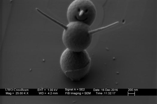 Potrivit descrierii ataşate imaginii postate în paginile Thumblr, aşa zisul om de zăpadă este de fapt construit prin suprapunerea a 3 sfere din silicat, fiecare cu diametru de 0.9 microni, miniatura rezultată având o înălţime de numai 0.003 mm. Spre comparaţie, un fir de păr uman măsoară aproximativ 75 microni în diametru (0,075mm).