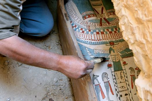 În acelaşi sit, arheologii au descoperit mai multe cranii aşezate în partea înaltă a mormintelor, iar sarcofagele prezentau imagini ale ocupanţilor lor, din care unele erau pictate în nuanţe vii de verde, roşu şi alb.