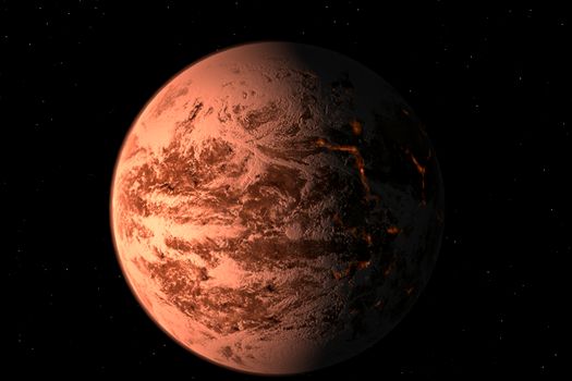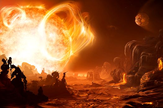 Pe cer, mai sus, este prezentată o lună ipotetică cu atmosfera subţire spulberată de vântul solar provenit de la pitica roşie.