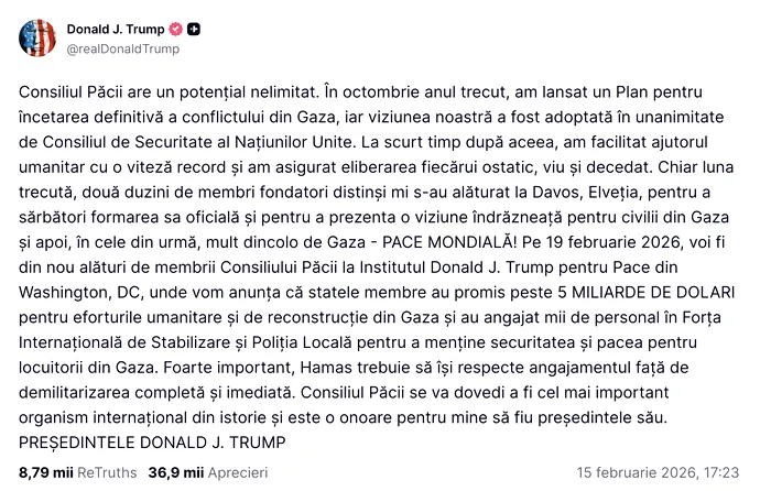 Președintele SUA, Donald Trump, a spus ieri, că în Consiliul pentru Pace se vor alătura „cei mai mari lideri din lume”.