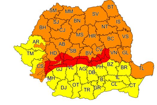 Alerta cod roşu vizează zona montană a judeţelor Caraş Severin, Mehedinţi, Hunedoara, Gorj, Alba, Sibiu, Vâlcea, Argeş, Braşov, Dâmboviţa, Prahova, Covasna, Buzău şi Vrancea.