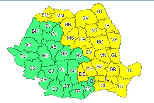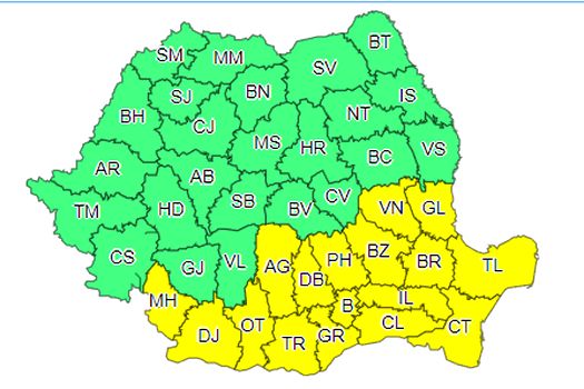 Avertizarea vizează Capitala şi judeţele Prahova, Dâmboviţa, Argeş, Dolj, Mehedinţi, Vrancea, Galaţi, Buzău, Brăila, Tulcea, Ialomiţa, Constanţa, Ilfov, Călăraşi, Giurgiu, Teleorman, Ilfov şi Olt.