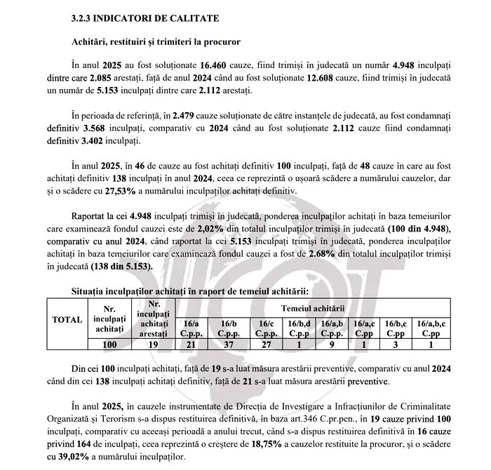 Se constată, așadar, o scădere a numărului și a ponderii inculpaților achitați definitiv în anul 2025, față de anul precedent, arată DIICOT.