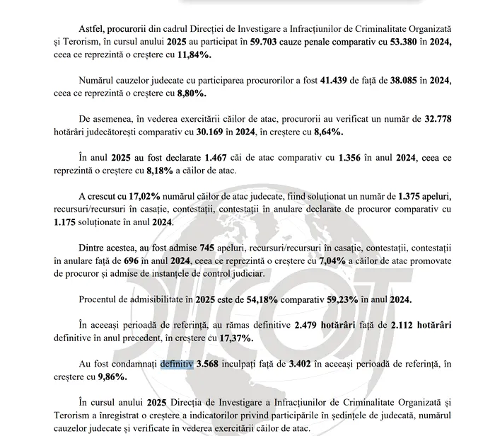 În 2025, potrivit bilanțului DIICOT, au fost condamnați definitiv 3.568 inculpați față de 3.402 în 2024, rata condamnărilor fiind în creștere cu 9,86%.