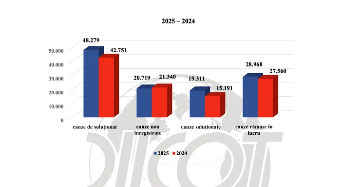 Se constată, astfel, în 2025, un plus de 5.528 cauze de soluționat, în creștere cu 12,93% și un minus de 621 cauze nou înregistrate, în scădere cu 2,91%, față de anul 2024.