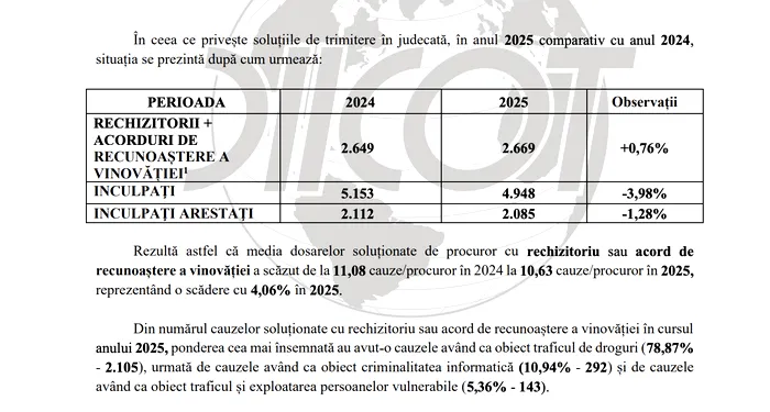 Prin comparație, în anul 2024 au fost soluționate 3.898 cauze, fiind trimiși în judecată un număr de 1004 inculpați dintre care 408 arestați, iar în cauzele soluționate de către instanțele de judecată, au fost condamnați definitiv 700 inculpați.
