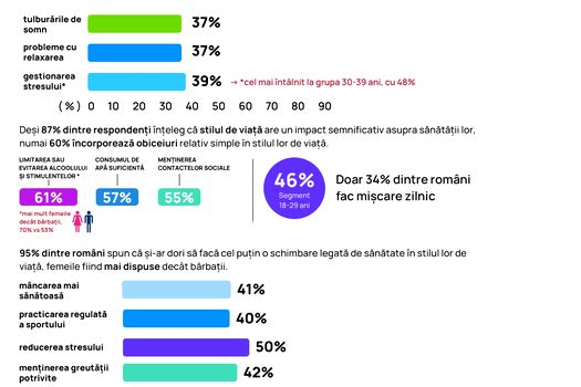 88% dintre români au cel puţin un simptom legat de o deteriorare a bunăstării lor fizice sau psihologice, cele mai întâlnite fiind gestionarea stresului (39%) (cel mai întâlnit la grupa 30-39 ani, cu 48%), problemele cu relaxarea (37%) şi tulburările de somn (37%). Deşi 87% dintre respondenţi înţeleg că stilul de viaţă are un impact semnificativ asupra sănătăţii lor, numai 60% încorporează obiceiuri relativ simple în stilul lor de viaţă, cum ar fi limitarea sau evitarea alcoolului şi stimulentelor (61%) (mai mult femeile decât bărbaţii, 70% vs 53%), consumul de apă suficientă (57%) sau menţinerea contactelor sociale (55%). Doar 34% dintre români fac mişcare zilnic, procentul fiind mai mare în rândul grupei de 18-29 ani (46%). 95% dintre români spun că şi-ar dori să facă cel puţin o schimbare legată de sănătate în stilul lor de viaţă, femeile fiind mai dispuse decât bărbaţii.