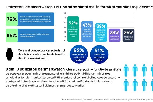 Datele în rândul utilizatorilor de smartwatch-uri din România arată că 52% dintre utilizatori şi-au îmbunătăţit rutina de exerciţii fizice, 43% au început să acorde prioritate obiceiurilor de somn, iar 39% au început să facă şi mai multe exerciţii fizice. 28% au început să ia mai multe pauze la locul de muncă, iar 26% au făcut modificări în dieta lor.