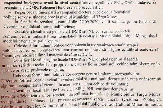 E vorba de un protocol de colaborare în vederea susţinerii reciproce la alegerile locale ce tocmai au trecut, încheiat între filialele PNL şi UDMR, din Târgu-Mureş.