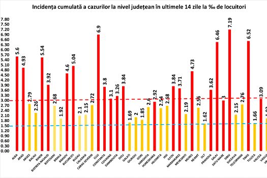 Coeficientul infectărilor cumulate la 14 zile, raportate la 1.000 de locuitori este calculat de către Direcţiile de Sănătate Publică, la nivelul Municipiului Bucureşti şi al judeţelor. Mai jos aveţi graficul realizat în baza raportărilor primite de CNCCI de la Direcţiile de Sănătate Publică: